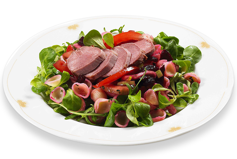 Balzsamecetes-céklás tésztasaláta füstölt nyelvvel