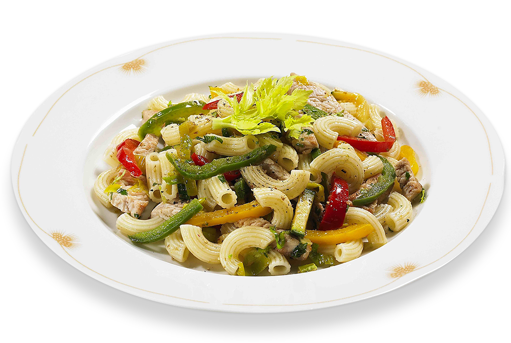 Currys pulykacsíkok pirított paprikával, szarvacskával