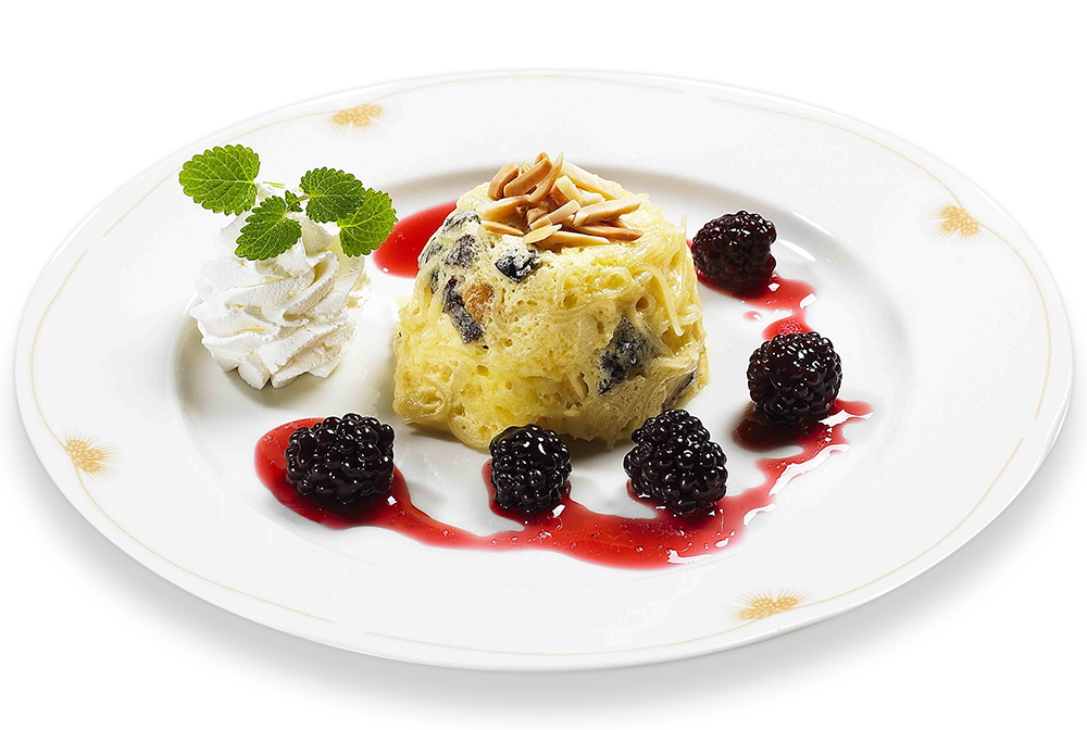 Melegen tálaljuk, tetejét megszórjuk a pirított mandulával, mellé tejszínhabot és szederöntetet adunk.