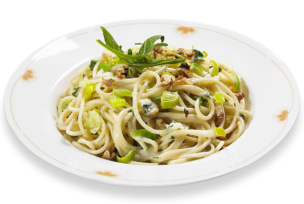 Megtisztítjuk, megmossuk és vékony fél karikára vágjuk a póréhagymát. Forró olajon megfuttatjuk, majd ráöntjük a tejet, és belemorzsoljuk a sajtot. Sózzuk, borsozzuk. Teszünk a tészta főzővizéből hozzá 1-2 dl-t és összeforraljuk. Vajon megfuttatjuk a gorombára vágott petrezselymet, és a tésztával együtt a mártásba tesszük. A tésztát nem mossuk le, csak szűrjük.