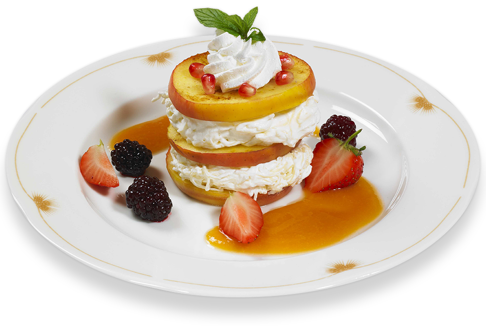 A mascarponét összekeverjük a tejszínnel, a kikapart vaníliával, habbá verjük, és a végén belekeverjük a cukrot. Összeforgatjuk a főtt, leöblített tésztával, és 1 órára hűtőbe tesszük. Az almát megmossuk, a közepét kiszúrjuk, és felszeleteljük. Az almakarikákat szárazon vagy kevés vajon megsütjük. Tálaláskor tányérra teszünk egy almakarikát, rá a mascarponés tésztát, majd ismét egy almakarikát. Ezt ismételgetjük 3-4 szintig.