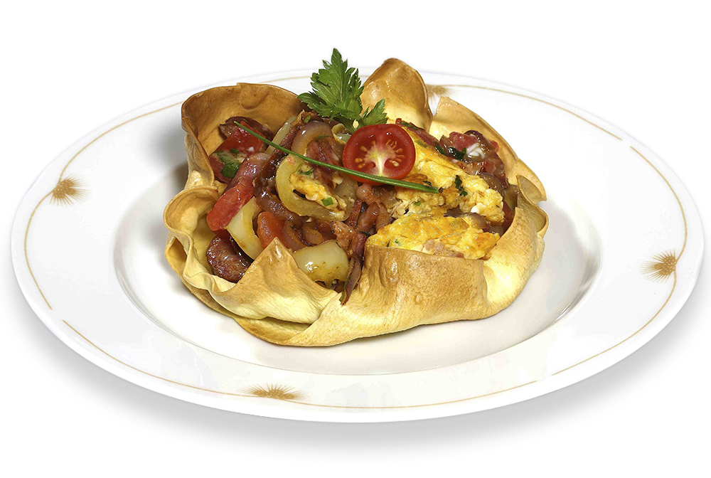 A húsos szalonnát csíkozzuk, és üvegesre pirítjuk. Rátesszük a fél karikára vágott kolbászt, a finomra vágott lilahagymát és a vékonyra szeletelt paprikát. Összepirítjuk 4-5 percig, majd megszórjuk a petrezselyemmel, borssal. Ha szükséges, sózzuk, elkeverjük és levesszük. Nagyobb edényben sós vizet forralunk, és a lapokat több részletben, a vízben félkeményre főzzük úgy 6 perc alatt, majd lapáttal kivesszük. Hideg vízben leöblítjük, és száraz ruhára téve leszárítjuk. Kis teflonos serpenyőket vagy formákat kiolajozunk, és a tésztával kibéleljük az alját úgy, hogy az oldalára is felérjen. Előmelegített 200oC-os sütőbe tesszük, 10-15 percig sütjük, hogy szép piros legyen a széle. A tésztakelyhekbe elosztjuk a kolbászos, szalonnás ragut. A tojásokat felverjük a tejföllel, kevés sóval, sütés előtt elosztjuk a kirakott serpenyőkön, megszórjuk reszelt sajttal.
