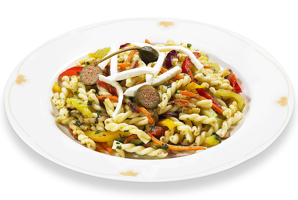 A zöldségeket megtisztítjuk, megmossuk és vékonyra metéljük. Az olívaolajon, erős tűzön megpirítjuk a zöldségeket. Sózzuk, borsozzuk, rátesszük a gorombára összevágott bazsalikomot, a pestot és a vajat. Összeforgatjuk, majd teszünk hozzá a tészta főzőlevéből, és összeforraljuk.